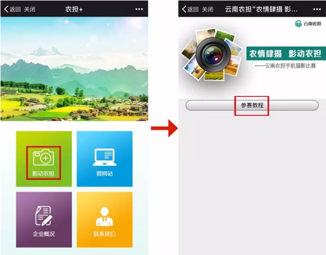 參與方式二:關(guān)注“云南農(nóng)擔(dān)”官方微信號,點擊“農(nóng)擔(dān)+”欄目,選擇“影動農(nóng)擔(dān)”進入,查看教程后,完成信息錄入,在對話框內(nèi)發(fā)送1張圖片及一句話描述即可。