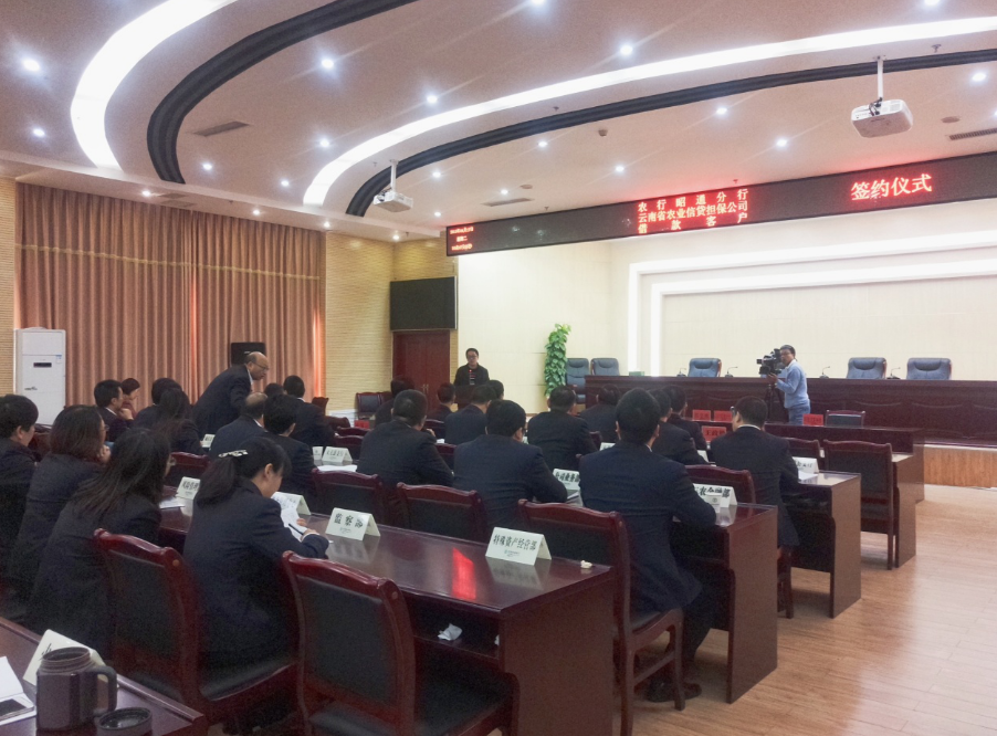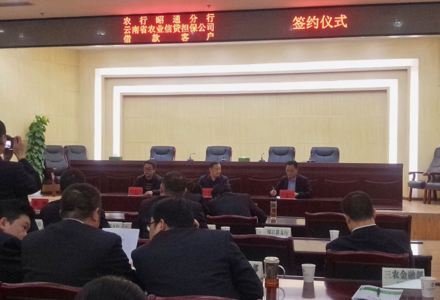 會議由農(nóng)業(yè)銀行分行三農(nóng)部負(fù)責(zé)人李國云主持,農(nóng)擔(dān)公司昭通辦事處朱磊代表公司分別與鹽津縣、綏江縣、永善縣支行行長及其借款客戶進(jìn)行簽約。