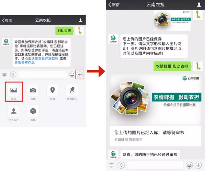 參與方式二:關(guān)注“云南農(nóng)擔(dān)”官方微信號,點擊“農(nóng)擔(dān)+”欄目,選擇“影動農(nóng)擔(dān)”進入,查看教程后,完成信息錄入,在對話框內(nèi)發(fā)送1張圖片及一句話描述即可。