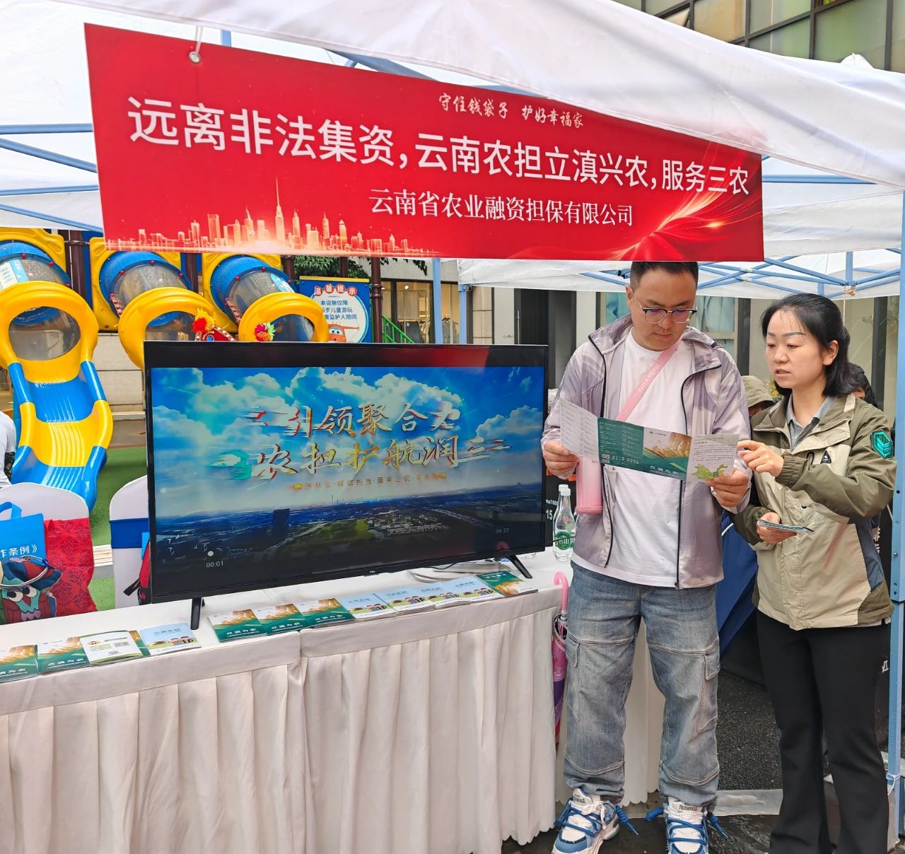 省農(nóng)擔(dān)公司設(shè)立專門咨詢臺(tái),通過(guò)發(fā)放業(yè)務(wù)宣傳折頁(yè),播放公司宣傳片,積極為參與群眾講解農(nóng)業(yè)融資擔(dān)保政策。用通俗易懂的語(yǔ)言,結(jié)合“虛假農(nóng)業(yè)項(xiàng)目融資”和“虛假擔(dān)?!钡鹊湫桶咐?,為老百姓深度剖析非法集資分子利用群眾對(duì)政策不熟悉、渴望低成本融資等心理實(shí)施詐騙的套路;并現(xiàn)場(chǎng)提醒群眾:“選擇農(nóng)業(yè)擔(dān)保服務(wù),認(rèn)準(zhǔn)云南農(nóng)擔(dān)官方渠道”,引導(dǎo)群眾通過(guò)正規(guī)擔(dān)保機(jī)構(gòu)獲取金融服務(wù),切實(shí)保護(hù)自身合法權(quán)益。