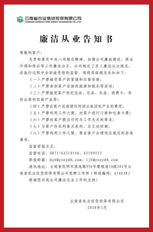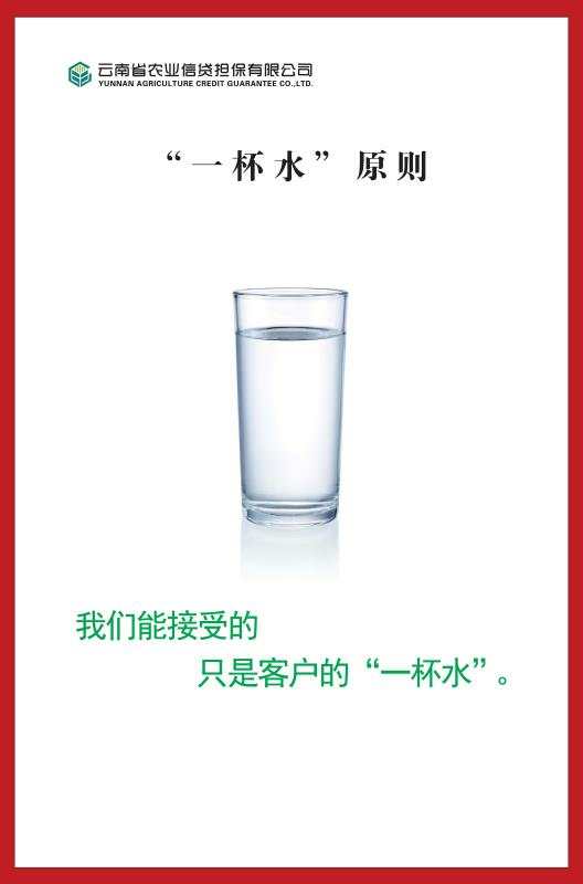 “一杯水”原則和《廉潔從業(yè)告知書》制度的實行,將對進一步強化員工的廉潔自律意識和廉潔從業(yè)意識,凈化公司廉政環(huán)境,加強公司廉政建設,維護公司良好形象發(fā)揮積極作用,托起云南農擔服務三農綠色美好愿景,讓云南農擔在實現(xiàn)云南經濟跨越發(fā)展和服務三農方面走得更高更遠,發(fā)揮更大作用。
